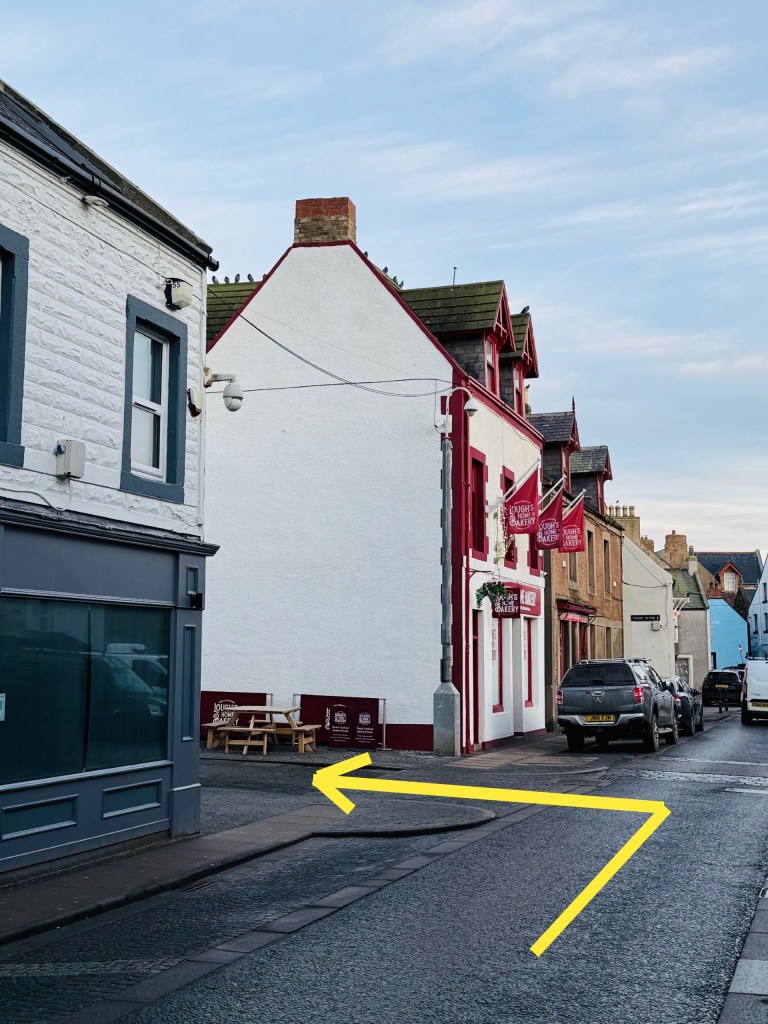 Whitecaps is at number 22 High Street, Eyemouth, TD14 5EU. When you see Lough’s Bakery (red and white building) on the left hand side of High Street, turn left just before it, then left again